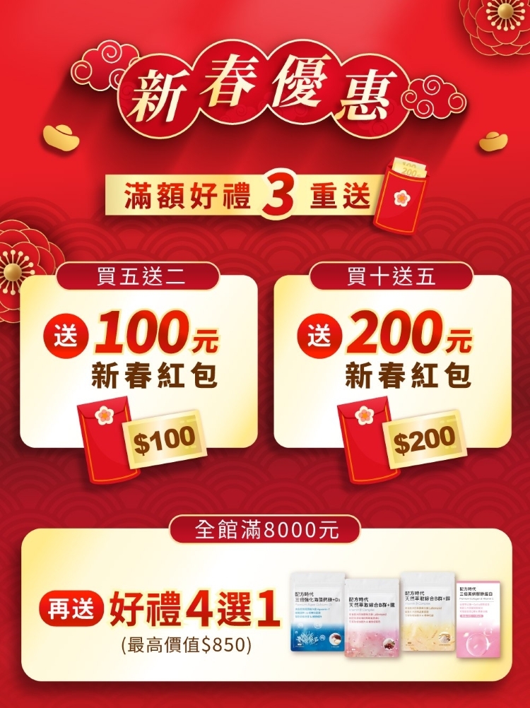 2️⃣買十送五,直接送【200元新春紅包💰】加碼再送好禮4選1 (膠原蛋白 / B群+鋅 / B群+鐵 / 海藻鈣 任選1款,最高價值$850)🎁